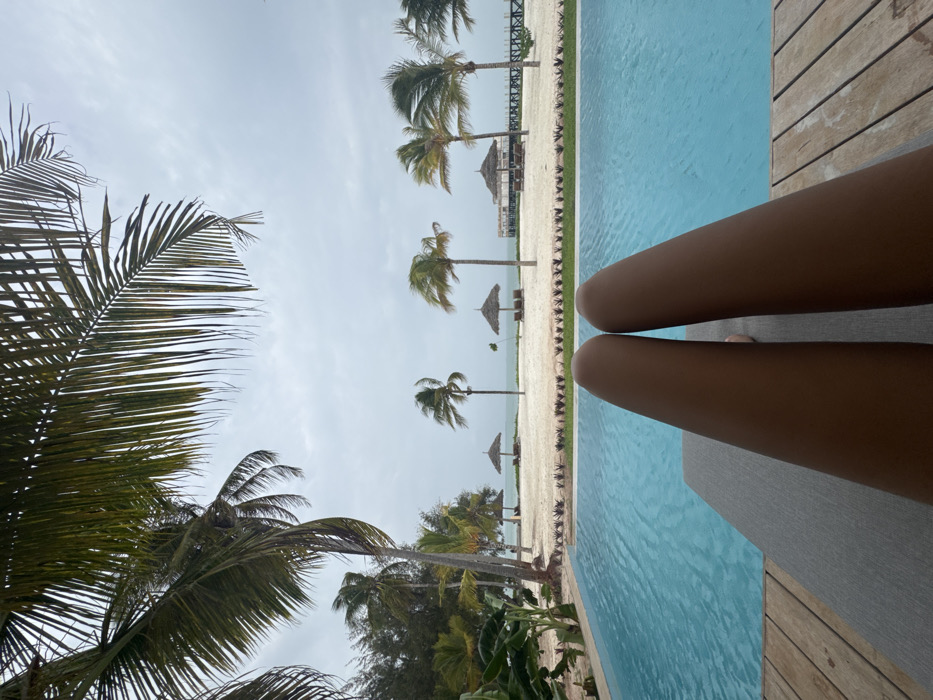 A tropical vista unfolds horizontally. Palm trees line a sandy beach next to a calm ocean under an overcast sky. To the side, a turquoise pool reflects the light, its edge meeting a wooden deck where a person's legs rest. Lush greenery is present in the foreground, creating a serene and relaxing scene.
