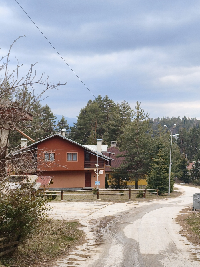 The image depicts a rural residential scene in Sveti Konstantin, Bulgaria, under a predominantly cloudy sky. In the foreground, a unpaved dirt and gravel road, showing darker damp patches and tire marks, curves from the lower center towards the right. To the left, leafless deciduous tree branches and green shrubbery partially obstruct the view, with a wooden fence section visible. On the far right, a grey metal dumpster with black wheels is present beside the road. The midground features a prominent two-story house with a reddish-brown upper facade and a lighter peach-colored lower section. This house has a dark gable roof, multiple white chimneys, and rectangular windows. A small wooden balcony extends from the upper right side of the house. Near its entrance, a light-colored pole supports what appears to be weather monitoring equipment, including an anemometer and rain gauge, with a small blue sign affixed below. A low, rustic wooden fence runs horizontally across the midground, separating the properties from the road. Behind the main house, another building with a reddish-brown tiled roof is partially visible, and further right, a bright yellow house is seen. The background is dominated by a dense conifer forest, primarily pine trees, covering undulating terrain that extends to distant mountains, faintly visible on the horizon through a light haze. A grey street lamp with two fixtures stands on the right side of the road, further into the scene. A thin, dark cable or power line traverses the upper portion of the frame diagonally from the top-left towards the mid-right. No individuals are present in the scene.