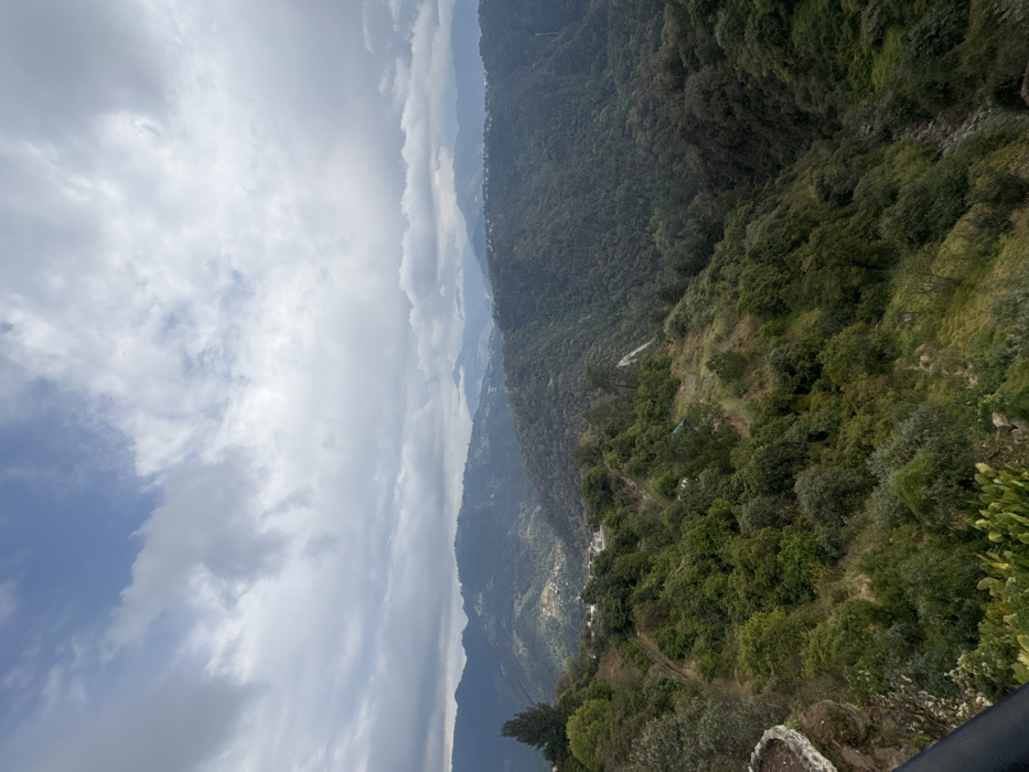 The image presents a panoramic view of a mountainous, heavily vegetated landscape in Zacatlán, Mexico. The sky is predominantly overcast with stratified grey and white clouds, exhibiting intermittent patches of light blue. Multiple layers of hills and mountains, densely covered in various shades of green foliage, recede into the distance, forming a series of valleys. Small clusters of buildings are observable on several distant hillsides, indicating human settlement within the terrain. A winding, light-colored path or road is visible traversing one of the intermediate slopes. In the lower left foreground, a segment of a curved, light-colored stone structure, possibly a wall or railing, is present, along with a dark, angled railing or barrier. No individuals, actions, or interactions are visible.