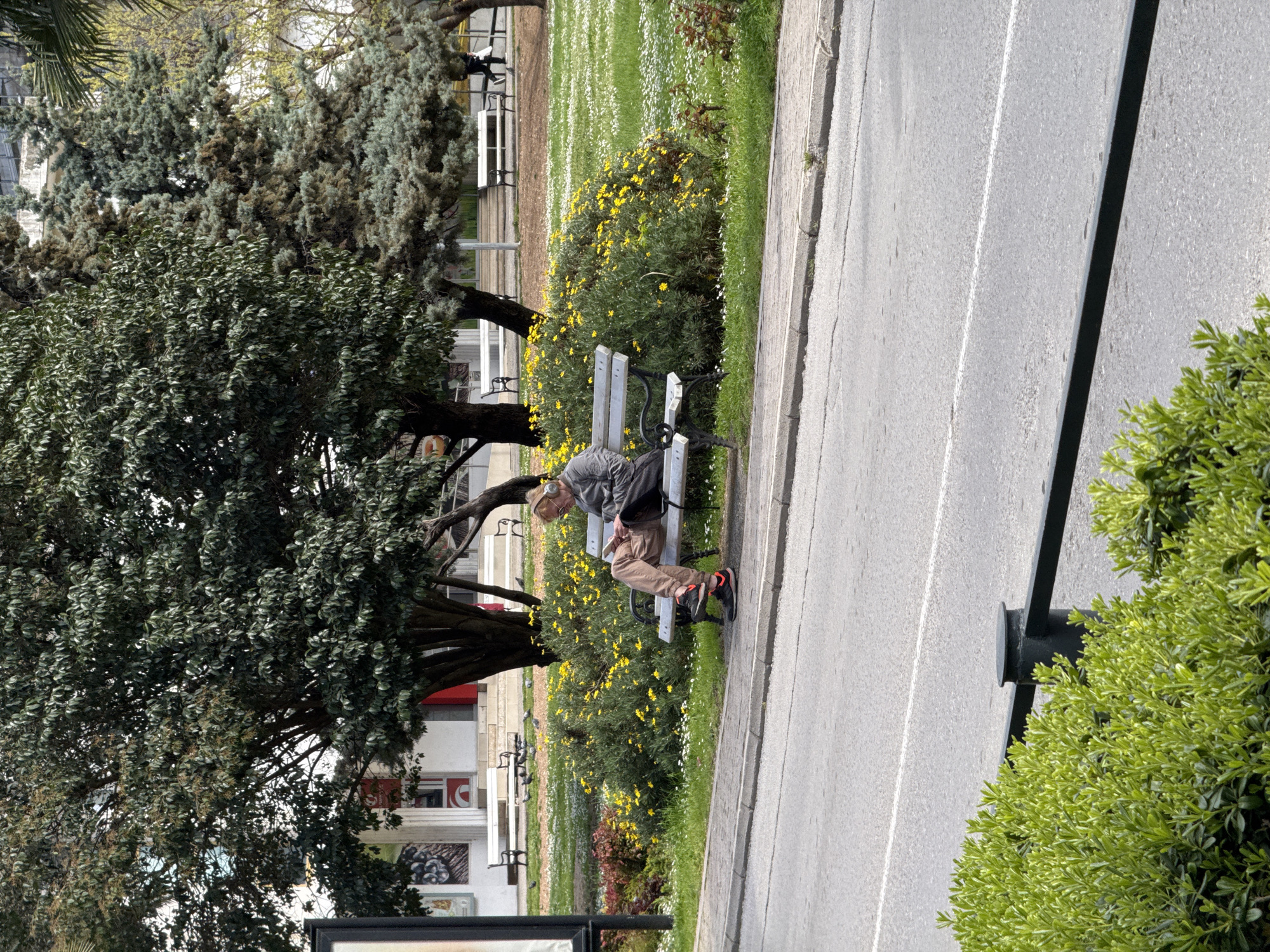 A man sits on a bench in a park in Budva, Montenegro. The park is adjacent to a street with a sidewalk. Yellow flowers grow around the bench. The man is wearing a gray jacket and khaki pants, and is sitting with his head down. Trees and buildings are visible in the background. There are benches behind the man. The scene seems to be captured during the day.