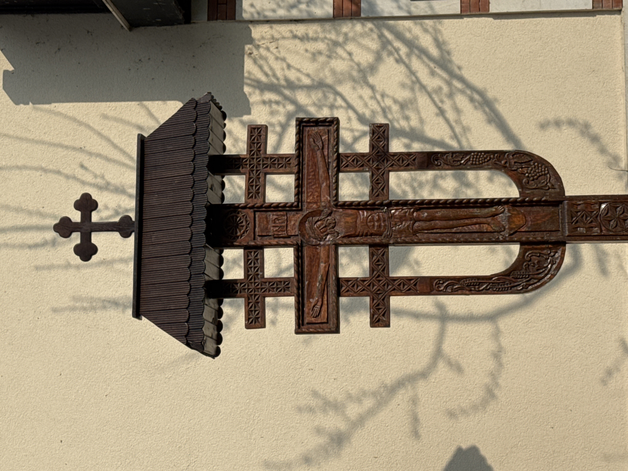 A horizontally oriented, medium shot depicts a dark, intricately carved wooden religious artifact mounted on a pale stucco exterior wall. The artifact has a horizontal cross-like shape with a rectangular frame in the center. Within the frame, a carved figure appears to be lying horizontally. Above and below the figure, carved rope-like designs are visible. Additional smaller crosses are carved at each end of the horizontal axis, with decorative cross-hatched patterns filling the space within their frames. A dark, miniature roof-like structure projects perpendicularly from the left side of the artifact, extending outward from the wall. The wall’s surface is a light beige or cream color with subtle variations in tone, suggesting a textured finish. The shadow of tree branches is cast onto the wall behind the artifact, creating a naturalistic and textural contrast against the manufactured form. The artifact appears to be located in Basarbovo, Bulgaria.