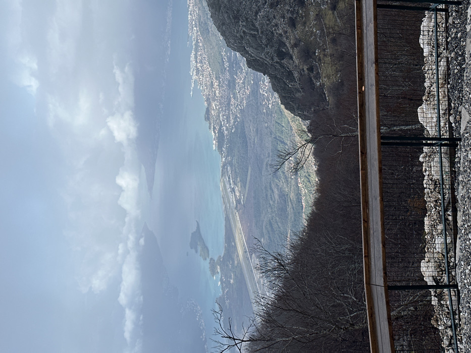 This image presents a wide, high-angle panoramic view overlooking the Bay of Kotor and its surroundings, presumably from a viewpoint near Kuk, Montenegro. In the immediate foreground, a wooden railing with a dark metal fence base spans the lower portion of the frame, indicating an observation point or roadside barrier. Below the railing, loose gravel and small rocks cover the ground. Sparse, leafless deciduous trees with dark branches are visible on the steep slope leading down from the viewpoint, suggesting a winter or early spring season. The midground features a prominent, long, light-colored airport runway, identifiable as Tivat Airport, situated on a relatively flat landmass extending into the bay. Adjacent to the runway, a scattering of buildings and infrastructure is visible. Beyond the airport, a densely populated coastal area with numerous white and light-colored buildings stretches along the shoreline, indicative of a city or multiple towns (likely Tivat and surrounding settlements) lining the bay. The land between the viewpoint and the coast is rugged and partially forested with bare trees, transitioning into a lighter green-brown hue further down. The background is dominated by the expansive, turquoise-blue waters of the Bay of Kotor, with several smaller landmasses or islands present within the bay, one of which appears to be a larger, elongated island. Distant mountains rise from the far side of the bay, their peaks and upper slopes partially obscured by a thick layer of grey and white clouds. The sky above is largely overcast with diffused light, contributing to a somewhat hazy atmospheric condition. No individuals or active movements are discernible in the scene.