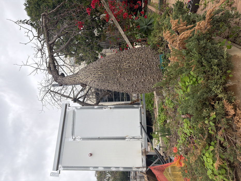 The image depicts an outdoor scene within the Eshkol Regional Council, Israel, under an overcast sky. In the left portion of the frame, a white, metal-clad modular unit stands elevated on a metal frame. This unit features a single white door with visible hinges and a latch on its right side, and a small red circular fixture on its left panel. Beneath the unit, dark pipes and various debris are visible. To the right of the modular unit, a large, distinctive tree trunk, likely a Silk Floss Tree (Ceiba insignis or Chorisia speciosa), rises vertically, tapering upwards from a wide base. Its entire visible trunk is densely covered with numerous pointed, cone-shaped thorns. The tree's upper branches are bare and extend horizontally and downwards to the right, intertwining with other green foliage. A green plaque is positioned at the base of the thorny tree. The foreground consists of an elevated garden bed or planter containing various vegetation, including dense green ground cover with rounded leaves, and patches of green and dried brown conifer-like shrubs. A crumpled orange and yellow net is present in the lower-left corner. In the midground, behind the thorny tree, a mix of lush green foliage, bright red flowering bushes (possibly bougainvillea), and an agave-like succulent are visible. A diagonal wooden beam or support structure extends into these red bushes from the right. Through the tree branches in the background, a building with reflective windows is partially discernible. On the far right, a section of a paved area with interlocking pavers and a black plastic crate are visible. No people are present.