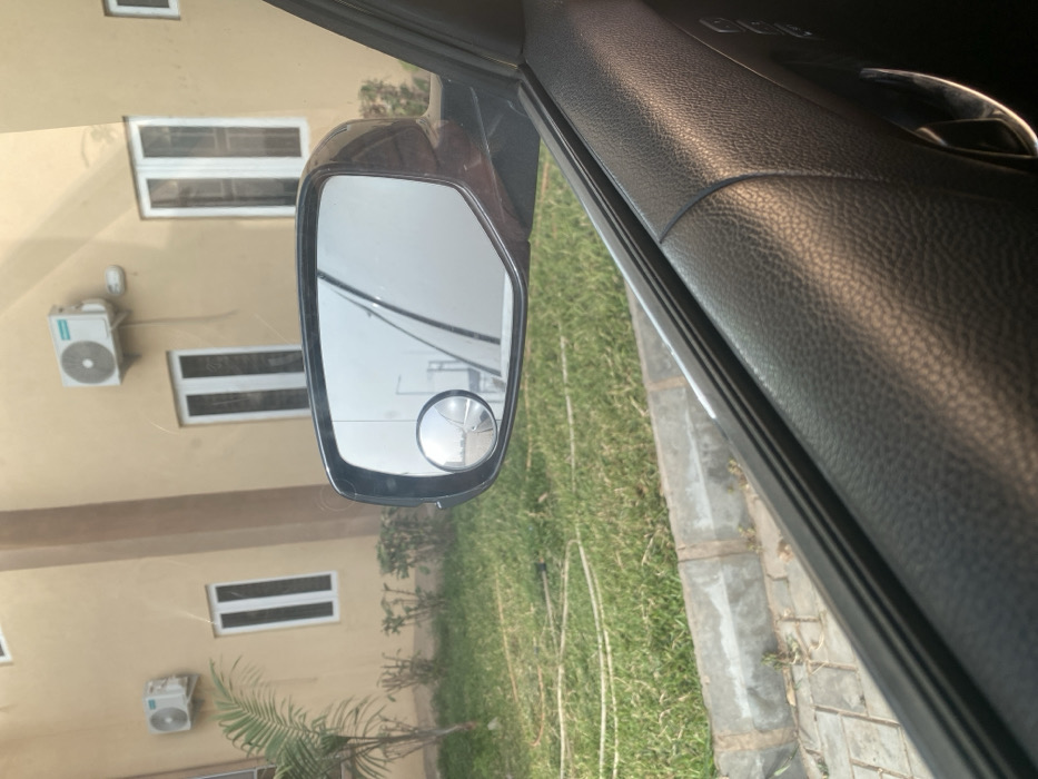 A side view mirror reflects a light tan building with multiple windows and air conditioning units. Green grass and sparse foliage are visible below. The mirror also features a small, round blind spot mirror. The foreground shows the interior of a car door, with a textured black surface, chrome trim, and a hint of a door handle. The image is taken from inside the car looking out.