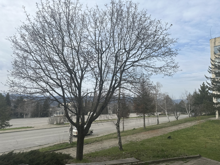 The image displays an urban landscape in Veliko Tarnovo, Bulgaria, observed from a slightly elevated perspective under a partially cloudy sky. In the immediate foreground, the bottom center features a partially visible wooden bench with horizontal slats. To its right, a grassy slope extends upwards and diagonally to the right, bisected by a paved pathway composed of light-colored interlocking pavers. A small, dark, irregularly shaped object rests on the grass on the right side of this pathway. Low green shrubs are visible at the bottom left. The midground is dominated by a large deciduous tree, centered towards the left, with numerous buds visible on its bare, dark branches. Behind this tree, a broad, empty paved surface, likely asphalt or concrete, extends horizontally across the scene. A light-colored sedan is parked facing left on the far side of this paved area, adjacent to a curb. Beyond the paved path and road, a line of diverse trees includes several slender, light-barked deciduous trees, possibly birches, interspersed with dark green evergreen conifers. In the background to the left, distant hills or mountains are visible. To the right, a multi-story, light-colored concrete building with visible windows and a flat roofline is partially framed by tall evergreen trees. An antenna-like structure protrudes from the top right corner of the building. The sky overhead shows scattered white clouds against a lighter blue. No people are visible in the scene.