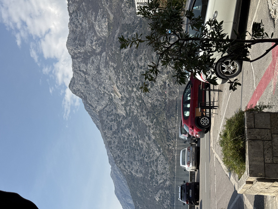 The image displays a daytime coastal scene in Risan, Montenegro. The sky is blue with scattered white cumulus clouds. In the foreground, a paved area, consistent with a parking lot or waterfront promenade, features a stone planter with green shrubbery on the left and a partially visible tree branch on the right. Vehicles parked on the paved surface include a red five-door hatchback with two black metal bar stools positioned on the pavement near its driver's side. Adjacent to it, a white sedan is parked facing away, displaying Montenegrin license plate "PG EC490". Further left, a black SUV is parked, also facing away, with Montenegrin license plate "HN CO988". A white SUV is partially visible on the far right. A red line is painted on the asphalt. Beyond the paved area and a low barrier, a calm body of water, likely the Bay of Kotor, extends towards the horizon. The background is dominated by a large, steep mountain range, characterized by grey, rugged limestone formations with sparse patches of green vegetation, rising directly from the water's edge.