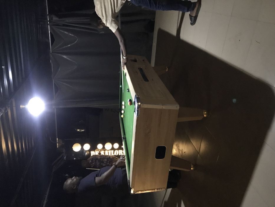 A billiard table dominates the scene with balls arranged on its green surface. Two people are playing pool, one leaning over the table to take a shot, another standing and adjusting the table. In the background, illuminated signage reads "DE SAILORS." The lighting creates a dramatic contrast with deep shadows on the floor and the building's walls made of metal.
