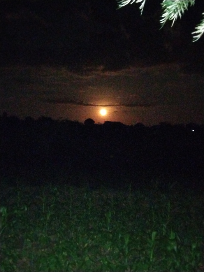 The image captures a night scene with a luminous moon peeking through a layer of clouds near the horizon. A dark, indistinct treeline spans the midground, silhouetted against the faintly lit sky. Below, a field of vegetation is partially illuminated in the dim light. Branches with sparse foliage are visible in the upper right corner of the image, completing the composition. The overall atmosphere is dark and mysterious.