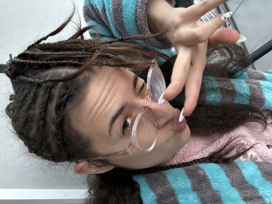 A female individual is depicted in a close-up, head-and-shoulders portrait shot, taken indoors in Tbilisi, Georgia. Her dark hair is styled with micro-braids, some sections pulled back and secured with a dark hair clip visible at the top of her head. She wears light pink-tinted, clear-framed glasses. Her left eye is open, directed towards the viewer, while her right eye is winking. Her forehead displays horizontal wrinkles, and her lips are pursed in a pouting expression. Her right hand is partially extended into the lower right of the frame, revealing long, pointed fingernails with white French tips; the ring finger and pinky finger also feature small red heart decals. She is dressed in a fuzzy garment with alternating light blue and dark grey horizontal stripes, appearing to be a bathrobe, worn over a visible light pink fuzzy garment. The background is a blurred, plain light-colored wall.