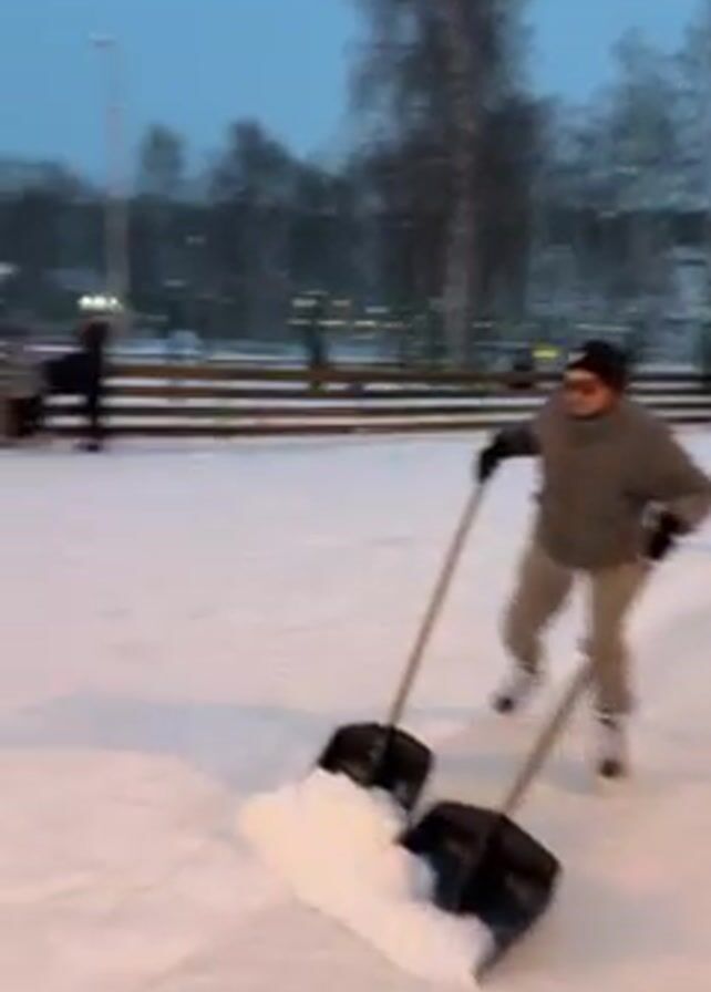 two people cleaning an ice rink. One person wears a grey jacket, tan pants, and black sunglasses, and they are using two snow shovels to push snow. The second person, wearing a black jacket and pants, is ice skating behind them. The ice rink is bordered by a low wooden fence and is decorated with string lights. In the background, there are leafless trees, buildings, a Christmas tree, and other people ice skating. It appears to be dusk or early evening.