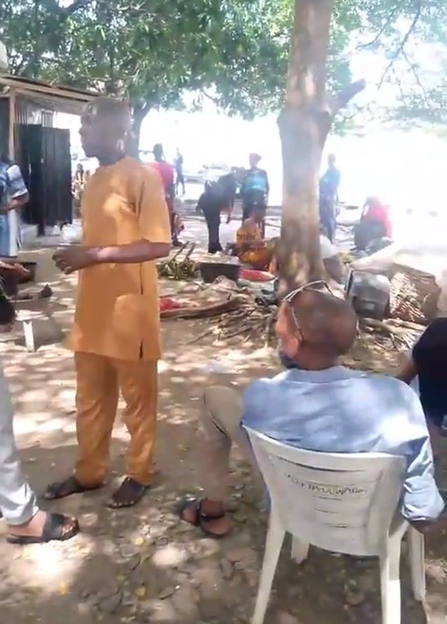 two people standing and talking to each other. A man is wearing an orange outfit and sandals. A woman is wearing a black long sleeve shirt with a graphic print, grey pants, and sandals. She is also wearing a headband. Another man is sitting in a plastic chair to the right of the frame, wearing a blue shirt. There are other people standing in the background. There is a makeshift shelter on the left of the frame. The ground is covered in dirt and small rocks. There are trees providing shade. The woman playfully kicks the man, who reacts with laughter.