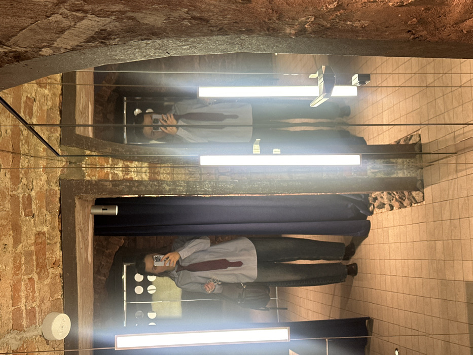 The image depicts a female individual taking a mirror selfie inside an interior location in Moscow, Russia. The setting is characterized by exposed red brick walls and arched structural elements, indicative of a renovated historical building, likely a retail space or boutique. The subject is partially visible on the left, with her full reflection prominently displayed in a large, floor-to-ceiling mirror on the right. She holds a white smartphone with both hands at chest height, pointed towards her reflection. She is dressed in a light-colored, long-sleeved collared shirt, a loosely tied burgundy necktie, dark wide-leg trousers, and dark shoes. A dark shoulder bag hangs from her left side. The environment features a light-colored tiled floor, dark blue fabric curtaining behind the subject, and a blend of modern and rustic elements. Dominant lighting includes two tall, illuminated vertical LED strip lights positioned in the foreground, reflecting brightly in the mirrors. Additional lighting consists of a white circular ceiling fixture and a silver cylindrical spotlight mounted on a dark vertical beam. Architectural details include dark structural beams and a decorative base of rough stones at the bottom of the mirrored partition.