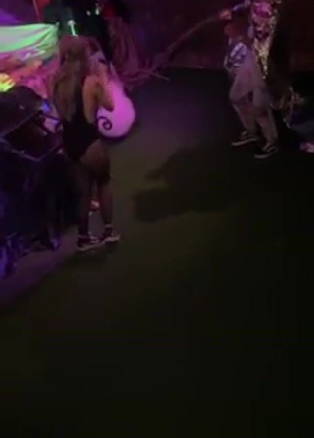two people in a dark, dimly lit room. One person is wearing a black leotard, fishnet stockings, and sneakers. They have long, blonde hair and are standing near some covered objects. The other person is wearing a metallic-looking poncho or cape, a hat, and sneakers. They are holding what appears to be a thin stick or pole. The room has a dark green floor, and there is some stage lighting visible, along with some Halloween decor. Both individuals appear to be moving around the room, but specific actions are unclear due to the limited view and lighting.