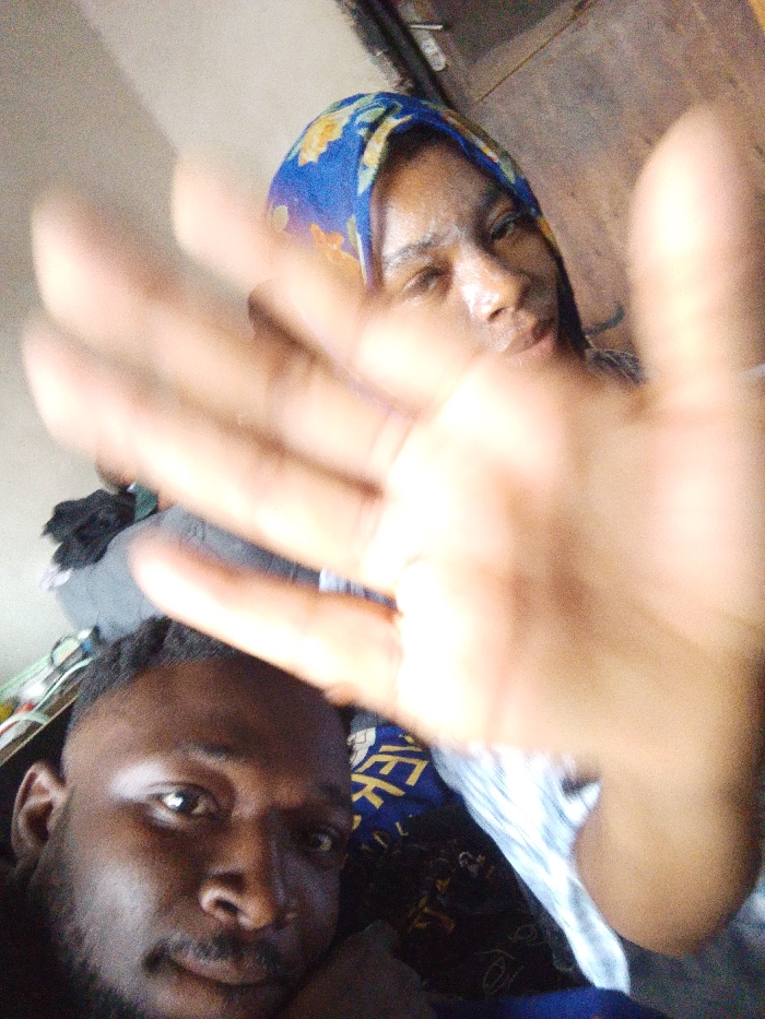 A close-up image depicts two individuals in an indoor setting within the city of Alaiyabiagba, Nigeria. In the foreground, spanning the lower left, is the face of a male with dark skin, a short beard, and dark hair, looking directly towards the camera. Partially obscuring the scene and extended towards the camera from the right is a blurry, light-skinned hand with fingers spread. Behind and to the right of the hand, in the upper part of the frame, is the face of a female with dark skin, wearing a blue hijab with yellow and orange floral patterns. Her expression appears neutral. The background behind the individuals shows a mix of light and dark surfaces, including what appears to be a wall, a darker vertical element (possibly a door frame), and various folded fabrics.