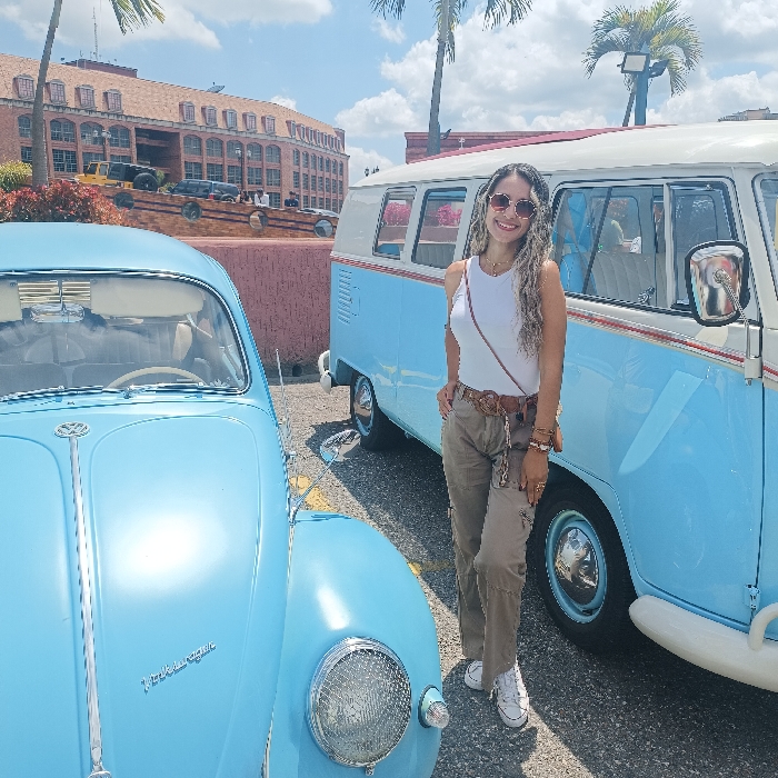 The scene is situated outdoors in Carrizal, Venezuela, under clear daylight conditions. One adult female stands centrally, facing the camera with a faint smile, her right hand resting on her hip. She has long, wavy, light-colored hair, wears sunglasses, a white sleeveless top, light brown cargo pants, white sneakers, a decorative brown belt, a cross-body bag with a brown strap, a necklace, and bracelets. To her left is the front quarter of a light blue classic Volkswagen Beetle (Type 1), displaying its headlight with a protective grill, chrome bumper elements, and partially visible "Volkswagen" script on the hood. To her right and slightly behind her is a light blue and white two-tone classic Volkswagen Type 2 (Bus), showing its side profile with chrome details and multiple windows. In the background, beyond a reddish-brown textured wall or barrier, a large, multi-story building with distinctive reddish-brown tiled roofs and light-colored facades is visible. Several vehicles, including SUVs, are parked on what appears to be an elevated terrace or road associated with this building. Tall palm trees are scattered throughout the background against a bright blue sky with scattered white clouds. The ground is paved, and shadows indicate direct sunlight.