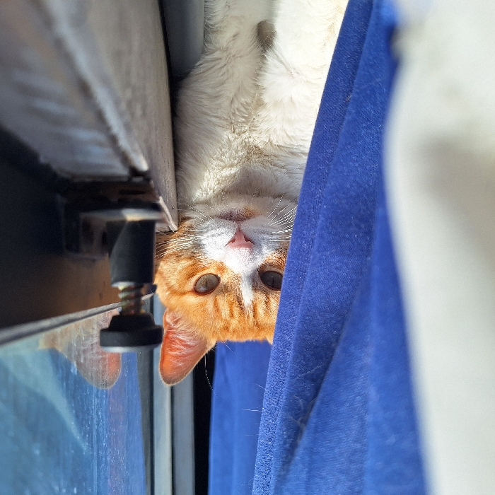 - "An orange and white tabby cat is positioned behind a blue curtain, peering directly at the viewer through a window opening" by FM-b0Aw43, licensed under CC BY 4.0