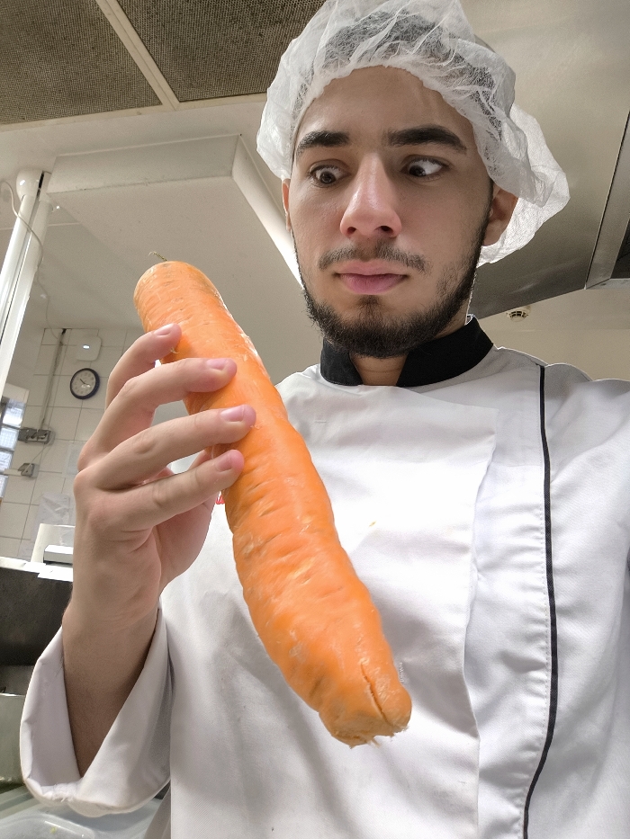 This image depicts a young adult male, likely a chef or culinary student, in a professional kitchen environment located in Strasbourg, France. He is wearing a white chef's jacket with black trim and a disposable white hairnet. His facial expression is exaggerated, featuring wide, crossed eyes fixed on an unusually large, long, unpeeled orange carrot held prominently in his left hand. The carrot occupies a significant portion of the left foreground. The background reveals typical kitchen elements, including white ceiling tiles with a grid, what appears to be a ventilation duct, a wall-mounted clock with a blue rim displaying approximately 1:55, and portions of a white counter and industrial equipment. The lighting is bright and overhead, characteristic of a commercial kitchen.