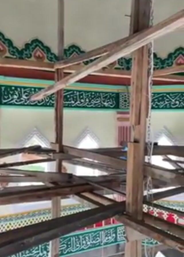 The interior of a building under construction is shown. A wooden scaffolding structure fills the frame, with light streaming through spaces between the boards. Above the scaffolding, the walls are decorated with colorful, intricate patterns and Arabic script. A person in a grey long-sleeved shirt and dark pants walks across the scaffolding in the background.