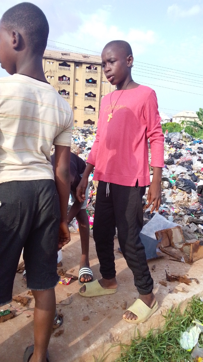 The image captures three young individuals in an unpaved area in Obosi, Nigeria, adjacent to a large accumulation of refuse