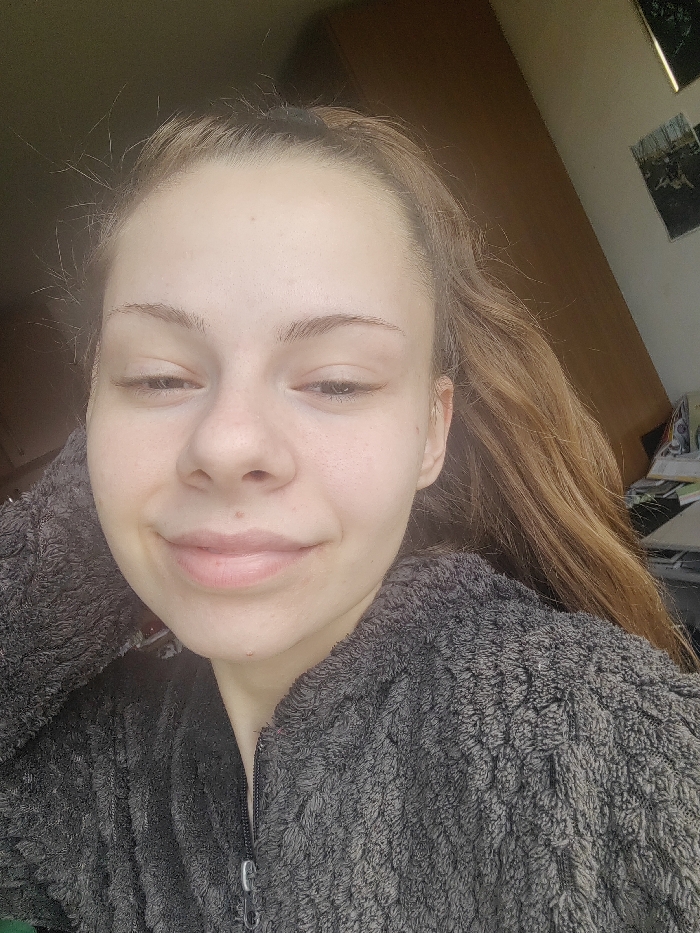 The image depicts a young Caucasian female, approximately late teens to early twenties, located indoors in Dolna Kremena, Bulgaria