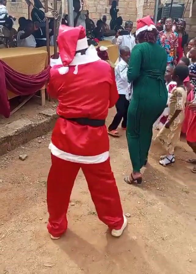 The video captures a full shot of a person dressed in a Santa Claus costume dancing in an outdoor setting