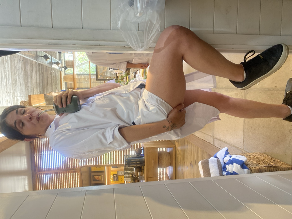 A woman reclines in an indoor setting, wearing a white button-down shirt and shorts, with dark sneakers on her feet. She holds a green tumbler to her lips, appearing to sip from it. A plastic bag hangs above her. The backdrop includes wooden-paneled walls and a room with natural light streaming through windows. Books and decorative items are visible on a nearby table. A woven basket with towels sits near her feet.