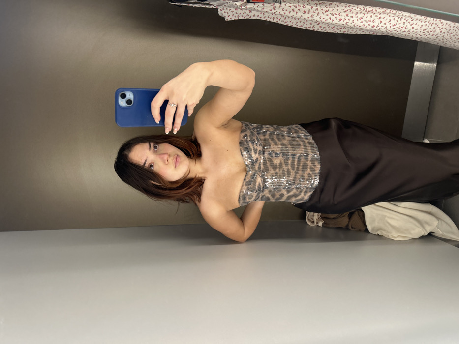 A young adult female is depicted standing in a retail fitting room, located in the city of Reichstett, France. She has medium-length, dark hair with lighter, possibly auburn, ends and a neutral facial expression, looking directly into the camera's reflection. She is wearing a strapless, sequined corset top featuring a tan and silver/black leopard print, paired with a long, black, silky skirt. Her left hand rests on her hip, while her right hand holds a blue-cased smartphone, angled to capture her reflection in a mirror. A silver ring with a clear stone is visible on her right ring finger. The fitting room features a light grey wall to her left and a darker, warm brown-grey wall behind her. In the lower left background, light-colored fabric items appear to be casually placed or discarded. To her right, a white garment with a small floral pattern and a visible white tag hangs on a rack or hook, partially visible.