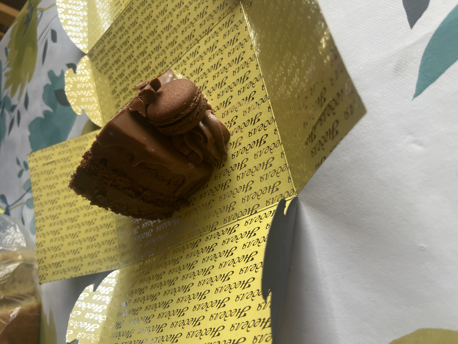 - "An individual slice of dark chocolate cake is presented within an open, yellow, foil-lined cardboard box" by FM-jg3Hf2, licensed under CC BY 4.0