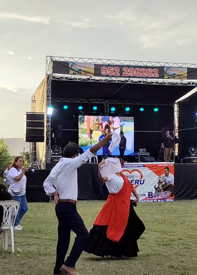The video captures a lively scene in an outdoor setting. A stage, bearing the name "DOMINGO" and the phone number "952 298262", is set up in the background. The stage features a large screen displaying a video and is equipped with speakers and lighting. In front of the stage, a political banner with the words "SOMOS PERU" and an image of a man named "BERRINCHE" is visible. Several people are scattered around, including a man and woman dancing in traditional clothing. The man is wearing a white shirt and black pants, while the woman is adorned in a white top, a red sash, and a long black skirt. They are holding white handkerchiefs and moving in a coordinated dance. Other individuals are present, some watching the performance and others taking pictures with their phones. The environment is a grassy field with a partially cloudy sky in the background.