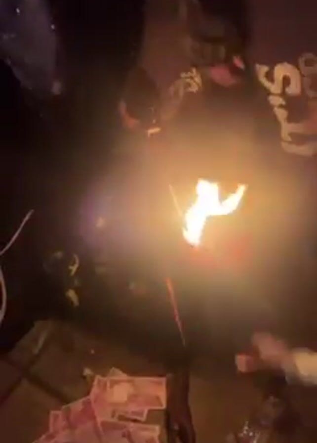 crowd of people gathered around a bonfire. There are several bank notes on the ground near the bonfire. The video is shot from above, looking down at the fire and the surrounding people. The lighting is dim, with the main source of light coming from the fire itself. The overall atmosphere appears celebratory.