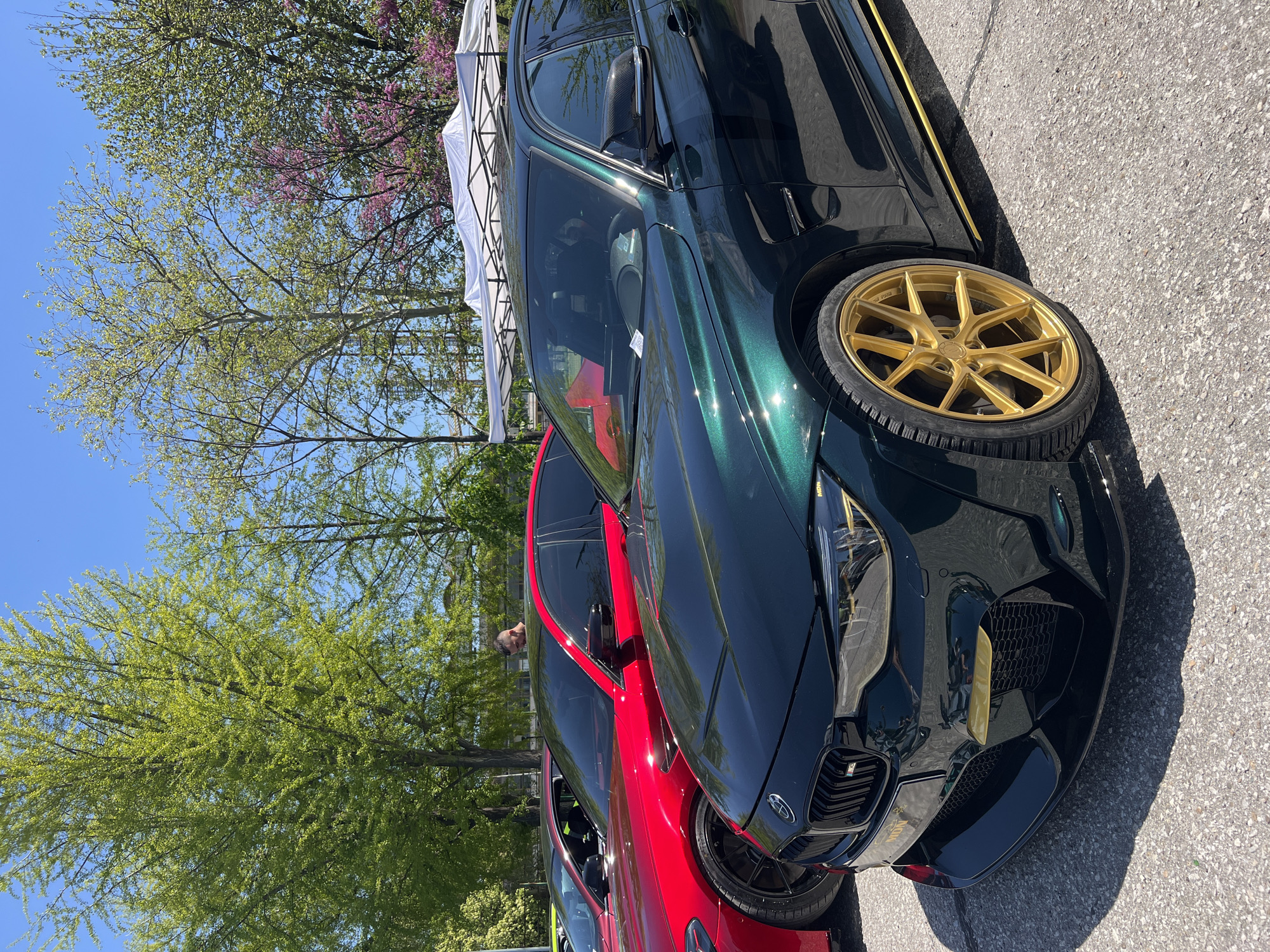 The image captures two cars parked in an outdoor setting under bright sunlight. The car in the foreground is dark green, possibly a metallic shade, with distinctive gold-colored rims and gold detailing on its front bumper. A red car is partially visible behind it. The background features trees with fresh green leaves and a glimpse of a blue sky. A white tent-like structure is also visible. The cars are parked on an asphalt surface. Considering the visual elements, there is not evidence to confirm the location of Plovdiv, Bulgaria.