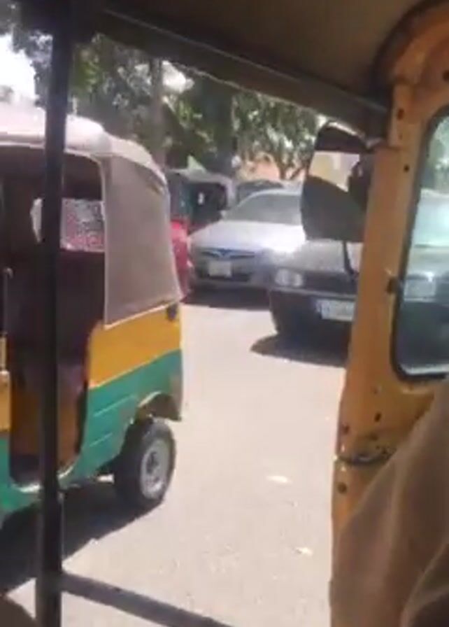 scene from inside a yellow auto-rickshaw, also known as a "tuk-tuk," as it navigates a street. Several other auto-rickshaws of the same type, painted in green and yellow, are visible around. There are other cars in the mix, including a black Volkswagen hatchback and a red Mercedes-Benz sedan. The street appears to be paved and the weather seems sunny, as indicated by the bright lighting. The inside of the tuk-tuk is simple, with the camera positioned behind the driver.