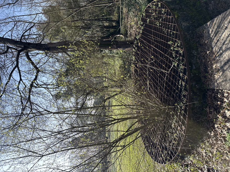 The scene depicts an outdoor vegetated area in Mealhada, Portugal, under clear daylight conditions. A circular, rusted metal grate with a square grid pattern, approximately 2 meters in diameter, dominates the foreground. This grate rests on a low, circular, moss-covered concrete or stone structure. A deciduous bush, approximately 1.5 meters tall, with multiple slender branches bearing nascent light-green leaves, grows through the central opening of the grate. The ground around the structure is covered with dried leaves and scattered small green plants. A light-grey concrete slab is partially visible on the ground in the lower right. The midground consists of a sunlit grassy expanse with various trees, some showing early leaf development, others still bare. The background features a denser collection of trees, ranging from bare to partially leafed, set against a clear blue sky. A prominent, large, dark-barked tree with extensive branches stands in the mid-right background. No individuals or active events are present.
