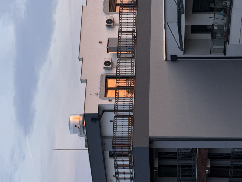 The scene depicts a multi-level architectural composition in Kragujevac, Serbia, under a cloudy sky during what appears to be late afternoon or early evening. No people are visible. The dominant feature is the upper section of a modern building with a white facade. Its rooftop features a large, cylindrical, metallic ventilation unit or tank, prominently reflecting warm orange light. A thin, tall antenna-like pole extends skyward from the roof on the left. A dark grey flat roof section or parapet is visible on the left, with a matching downspout running vertically. Below this, a spacious terrace or balcony is enclosed by a black wrought iron railing with ornate circular motifs. Behind this railing, multiple glass doors or large windows reflect the same intense orange light, suggesting internal illumination or direct sun exposure. Two white outdoor air conditioning units are mounted on the white facade to the right of these illuminated openings. Patches of grey plaster are visible around some window frames, indicating recent construction or repair. The building's roof line on the right side features stepped sections. Below this upper structure, a large section of a light grey building facade is visible, forming the base for the upper terrace. To the lower left, a portion of another building shows a balcony with dark railings and a section of reddish-brown brickwork. To the lower right, a distinct white-facade building presents a balcony with clear glass railings, upon which several indeterminate objects (possibly planters or containers) are placed. This lower-right balcony is partially covered by a small, dark, slanted awning. A dark grey downspout is also present on this building's wall. The sky overhead is light blue with scattered grey and white clouds.