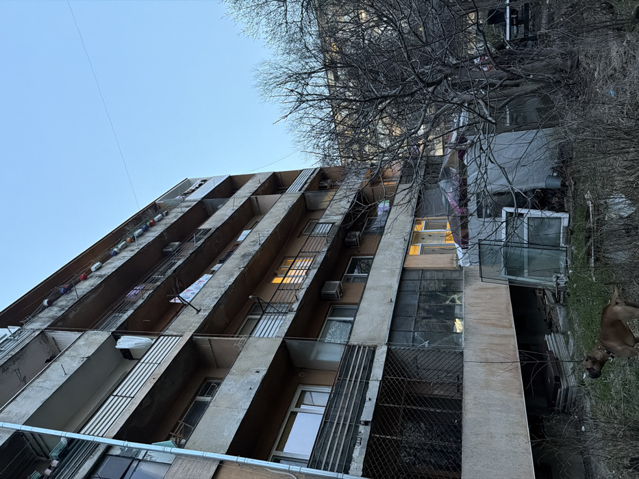 The image depicts a multi-story residential building located in Sofia, Bulgaria, viewed from ground level at an upward angle