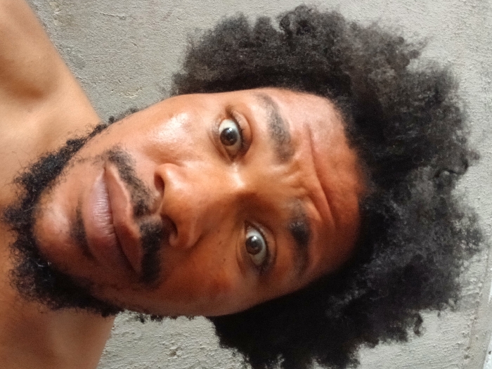 A close-up, frontal portrait features an adult male with dark, voluminous, curly hair and a dark, patchy beard and mustache