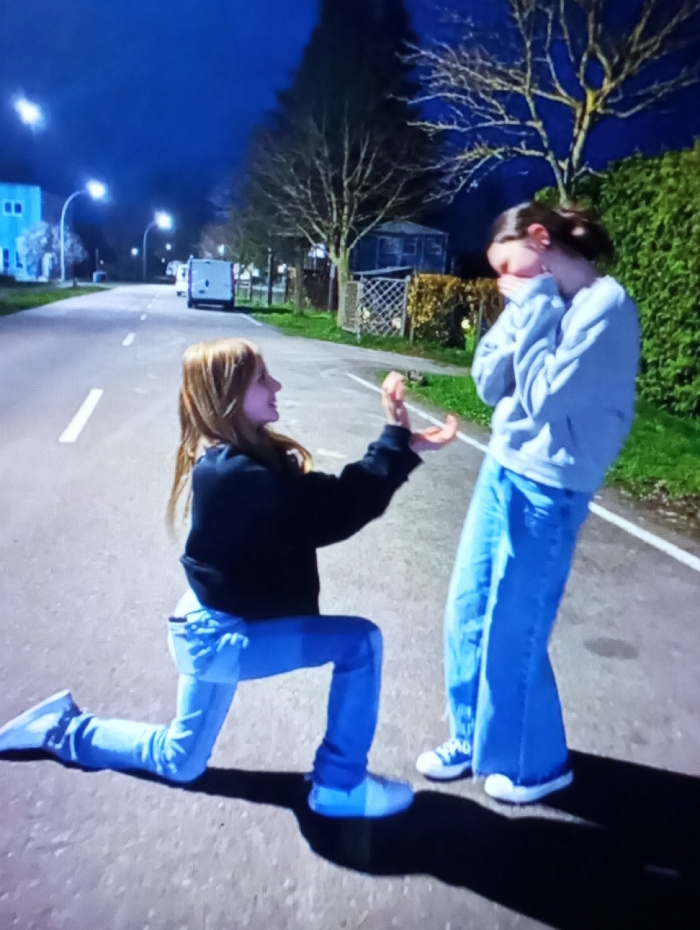 The image depicts a nighttime scene on a paved road in Mirbozor, Uzbekistan. Two young individuals are present. On the left, a person with long, light brown hair, dressed in a dark long-sleeved top, light blue jeans, and white sneakers, is kneeling on their right knee. Their hands are open and raised, palms upwards, facing the second individual. On the right, a second person with dark hair, wearing a light blue hooded sweatshirt, wide-legged light blue jeans, and white sneakers with blue accents, stands facing the kneeling individual. This person has their right hand covering their mouth and nose. The background features a paved road with white dashed lines. Multiple streetlights illuminate the area. To the left, a light-colored building is visible. Further down the road, a white van is present. To the right, a tall green hedge lines the road, behind which are leafless trees and a faint structure. The sky is dark.
