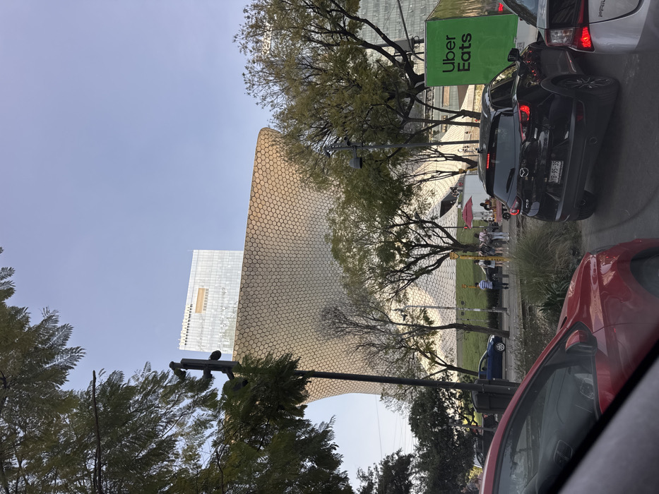 The Soumaya Museum is seen from a low angle. Its distinctive, honeycomb-patterned facade contrasts with a modern, glass-clad structure behind it. Tall trees partially obscure the buildings. An Uber Eats sign is visible above a line of cars waiting at a light. A black Mazda is visible with the license plate. People are dining on the patio outside the museum.