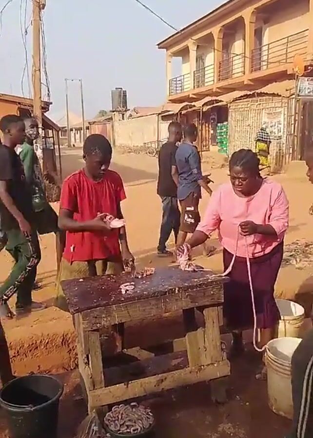 two people standing at a wooden table outdoors, likely in a street or market area. A younger person in a red t-shirt is cutting what appears to be raw meat or fish on the table. An older woman in a pink shirt stands to their right and seems to be preparing a long, thin piece of meat. There are several buckets and containers around the table, one filled with what looks like small, unidentified pieces of food. The ground around the table appears muddy. Several other people are walking past in the background. A two-story building with shops is visible on the right, and a street extends into the distance on the left. The sky is overcast, suggesting it is daytime.
