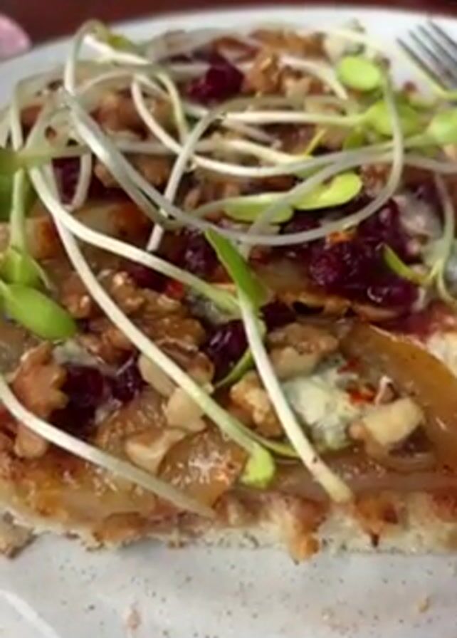 close-up of a partially eaten slice of flatbread or pizza on a speckled white plate. The toppings include sliced pears, walnuts, cranberries, blue cheese crumbles, and a garnish of tall, thin sprouts with tiny green leaves. A fork rests on the right side of the plate. Sunglasses are blurred in the background, along with some red and white ribbon. The lighting is natural, and the camera zooms in slightly during the video. Upbeat music plays in the background.