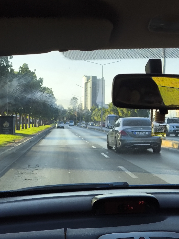 The image depicts a forward view from inside a moving vehicle on a multi-lane road in Gonyeli, Northern Cyprus / Cyprus, under bright daylight. The foreground reveals the vehicle's dark dashboard, with a digital display showing "27° KM". A rearview mirror hangs from the top right of the windshield, reflecting a yellowish tint, and has an air freshener suspended from it, labeled "DİKKAT" (Turkish for "CAUTION") along with smaller Turkish text. The windshield itself exhibits visible streaks and residue, particularly on the left side. Ahead, a grey Mercedes-Benz sedan, bearing Northern Cypriot license plate "AA 814 A", occupies the right lane. The road surface shows areas of wear and minor cracking. To the left, a landscaped median strip features a row of uniformly spaced trees and green grass, with a dark rectangular sign partially visible. Further down the road, additional vehicles, including cars, a white van, and a bus, indicate moderate traffic flow. Streetlights line the road on both sides. In the background, under a clear sky, a prominent, modern tall building with a distinctive architectural profile stands out against the horizon, characteristic of the city's skyline.
