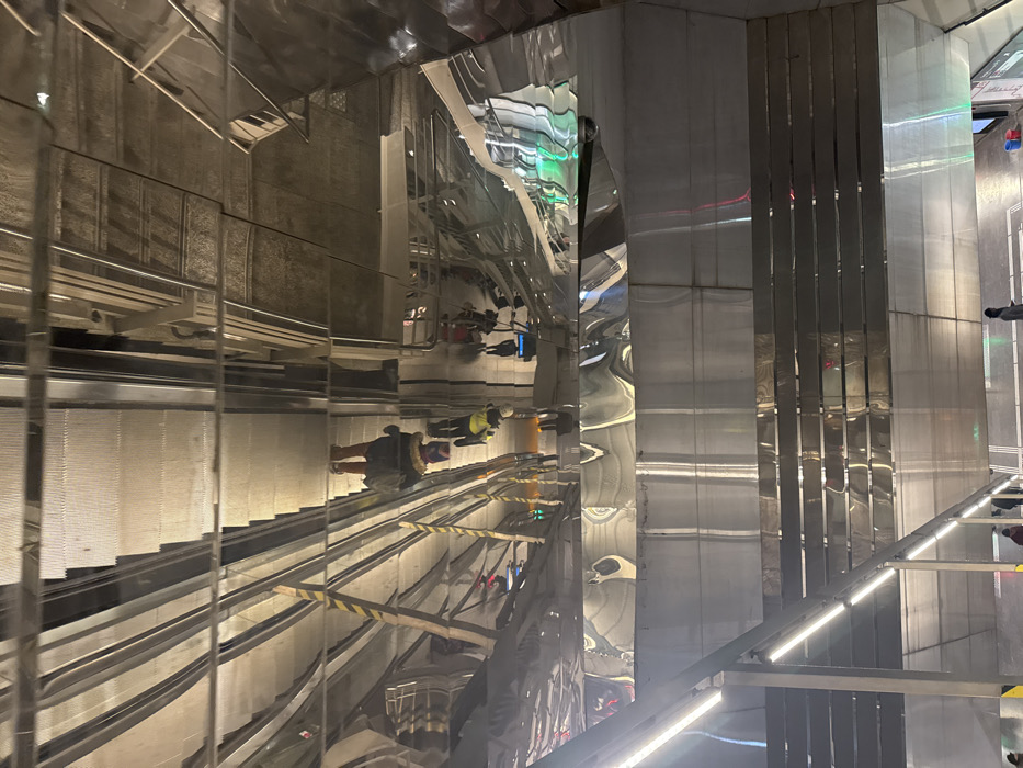 A distorted, mirrored view inside a building. People ride an escalator downwards. The architecture is sleek and metallic, with long, vertical panels. Reflections create a disorienting sense of depth and duplicate the scene, mixing images of stairs and the escalator. The lighting is bright and artificial, emphasizing the metallic sheen of the surfaces.