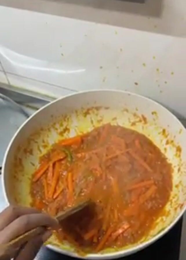 A pair of dark-skinned hands stir orange-colored carrots in a light-colored frying pan on a black electric stovetop. The stovetop shows digital information, including a temperature of 143 and green lights. The frying pan contains a reddish-orange sauce with julienned carrots and some green slices. The hands use a wooden spoon to mix the ingredients. There is an aluminum-colored vent hood above the stove and white surfaces surrounding the cooking area. Steam rises from the pan.