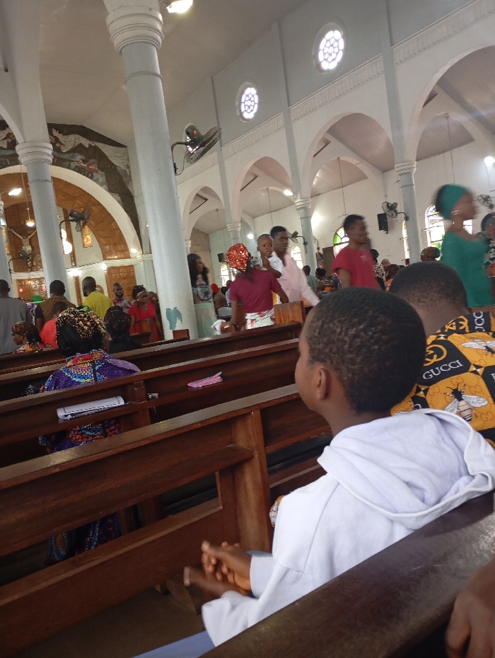 The image depicts the interior of a church in an unknown city. The architecture features high white ceilings, prominent light-colored round pillars, and walls adorned with multiple arched and circular windows. Wooden pews line the floor, arranged for congregants. In the foreground, a child with short dark hair is seen from behind and slightly to the right, seated in a dark wooden pew. The child wears a white hooded top and has hands clasped in front. To the immediate right of this child, a portion of an adult's back is visible, dressed in a yellow and black patterned fabric with a bee motif. Further back in the pews, another individual is seated, wearing a colorful garment patterned in purple, blue, and orange. A white booklet and a small pink object rest on the pew in front of them. In the mid-ground, several individuals, including adults and children, are standing and moving in the aisles between pews. Notable figures among them include a woman with a red patterned headwrap and maroon top holding a child, a man in a light pink shirt holding another child, a man in a red t-shirt, and a woman in a green headwrap and green dress. Ceiling fans are mounted on the pillars throughout the space. Towards the left side of the sanctuary, a crucifix is visible, along with a large, elaborate mural behind what appears to be an altar area. The scene indicates a religious gathering or service in progress.