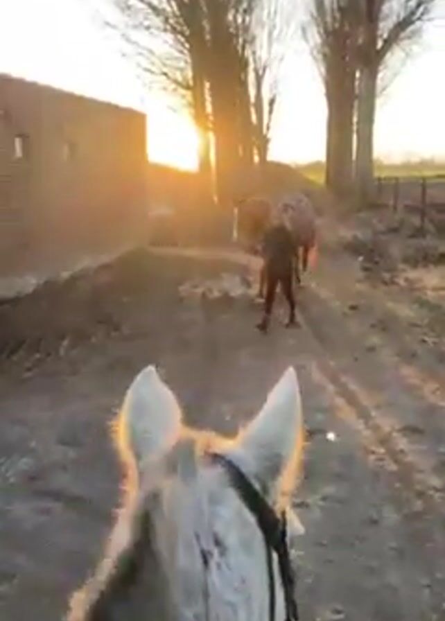 A horse ridden by a person filming is standing on a path. Another person walks with two other horses, one wearing a spotted blanket, down the path, lit by the setting sun. The path is framed by trees on both sides. A brick building is on the left side of the path. A field is on the right.