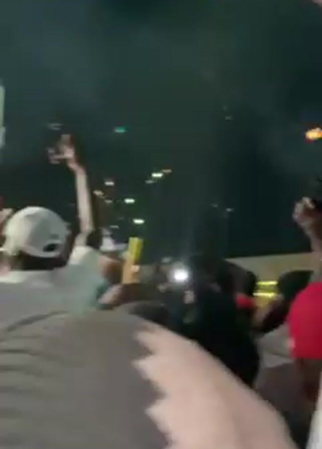 A large crowd of people is watching a countdown timer on a large screen, presumably for New Year's Eve. The timer displays numbers decreasing from 0:26. Fireworks are seen in the background. There are tall illuminated structures resembling Christmas decorations. Some people are holding phones, recording the event. A person in the crowd is wearing a Santa hat. It is nighttime.