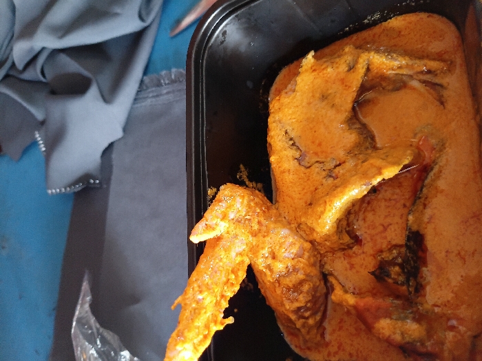 A close-up image displays a black rectangular container holding a serving of food. The food consists of at least two pieces of what appears to be poultry or fish, heavily coated and largely submerged in a thick, vibrant orange-red sauce or stew. One elongated piece, possibly a chicken wing, extends upwards from the sauce on the left side of the container. The background features a blue surface, possibly a tabletop or counter, partially covered by a crumpled dark grey fabric material. To the upper left, a translucent crumpled plastic bag is visible, and the tip of a metallic object, resembling scissors or a knife, is present on the right edge of the frame, near the fabric. No people are visible, and no actions or interactions are depicted. The specific location in the city of Ado, Nigeria, cannot be determined from the visual information provided.