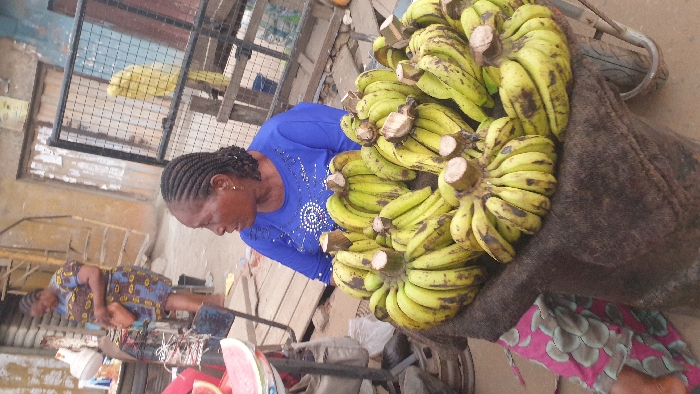 The scene is an outdoor market in Nkpor, Nigeria. A seated adult female, dark-skinned with braided hair, wearing a royal blue top featuring a white circular pattern and a pink floral patterned wrapper, is positioned behind a prominent display of approximately ten bunches of yellowish-green plantains or cooking bananas. Many of the plantains exhibit dark spots. Her head is turned towards the right of the frame, and she wears small earrings. To her immediate left, a slice of red watermelon rests on a white surface, adjacent to the upper portion of a mechanical weighing scale with dark components. The plantains are arranged on a dark brown, possibly fabric-covered, surface, which appears to be part of a mobile cart, with a tire and metallic support structure visible to the lower right. In the mid-background, a second adult female, also dark-skinned, wearing a brown and blue patterned dress, stands looking downwards, appearing to attend to a nearby stall. The background consists of weathered building facades, including a light brown section and a bluish-grey section, alongside a dark metal grid fence. A bright yellow garment or fabric is draped behind the fence. The ground comprises dirt and wooden planks, characteristic of an informal market setting.