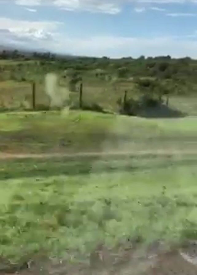 rural landscape viewed from a moving vehicle. The view includes green fields, scattered bushes and trees, and a wire fence. The sky is partly cloudy. A metal guardrail is visible in the foreground, indicating the vehicle is likely on a road or highway. The overall scene suggests a countryside or agricultural area. The view from the window is somewhat obstructed by water spots on the glass.