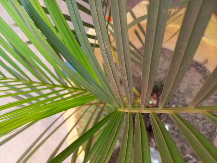 A close-up shot captures a fan-shaped palm frond. Its vibrant green leaves extend outward, exhibiting linear patterns against a sunlit background. Some leaves exhibit a brown tinge, casting shadows on others and revealing a pot filled with soil. The central stalk is visible, connecting each leaflet. The light source creates contrast, emphasizing the textures and shapes of the palm leaves.